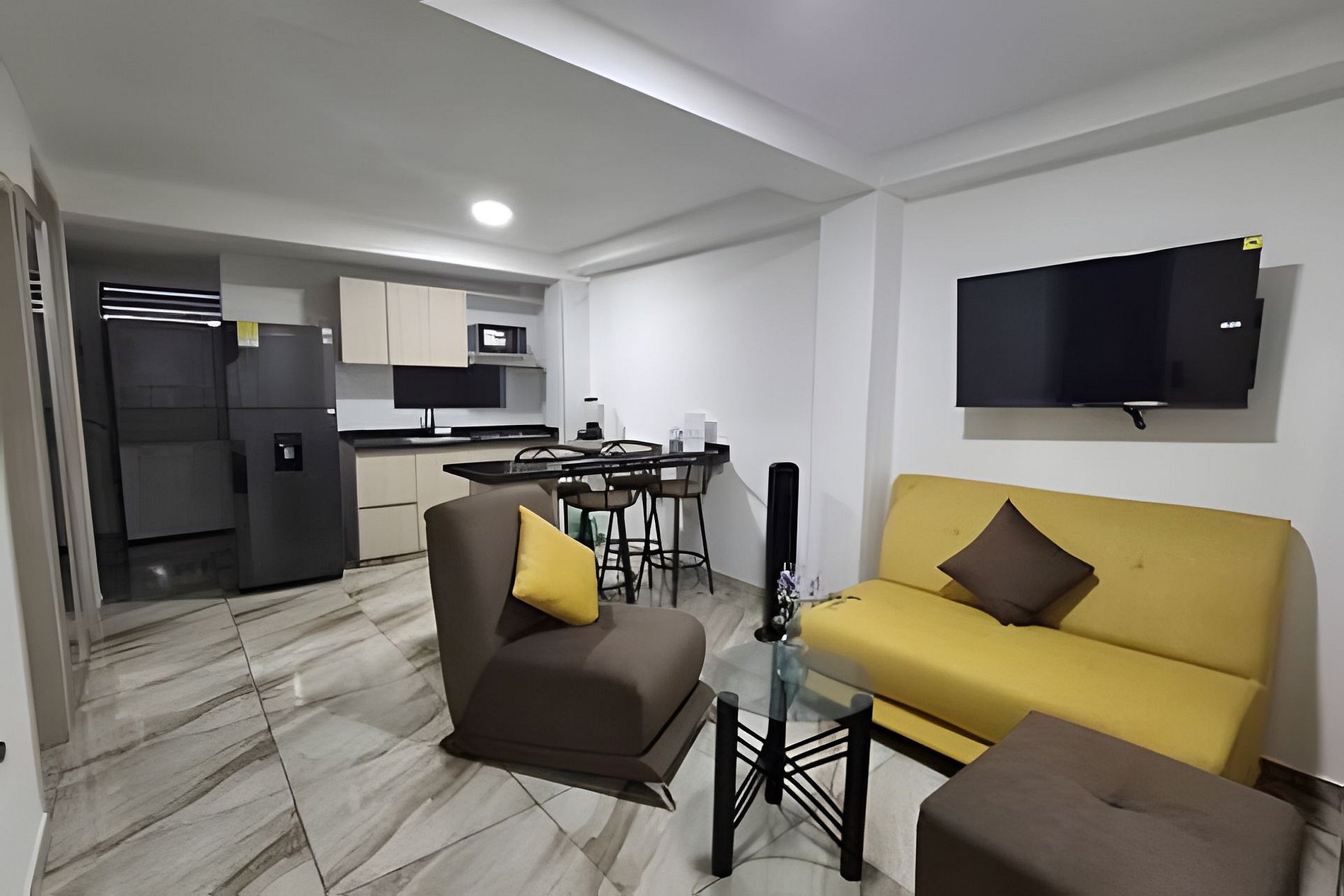 Este alojamiento único tiene mucho espacio para que disfrutes con los tuyos o con tus compañeros de trabajo o con amigos de vacaciones. nuevo y cómodo apartamento de 2 habitaciones, AA, calentador. habitación ppal. con cama Queen y baño, 2da habitación con 2 camas sencillas de 100cm x 190cm y baño, cocina equipada , sala, cuarto de ropas con torre lavadora secadora, una hermosa terraza de zona comun con BBQ
